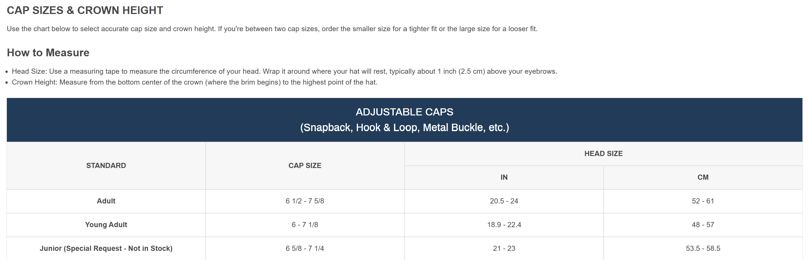 | CAP SIZE | 6 1/2 - 7 5/8 |